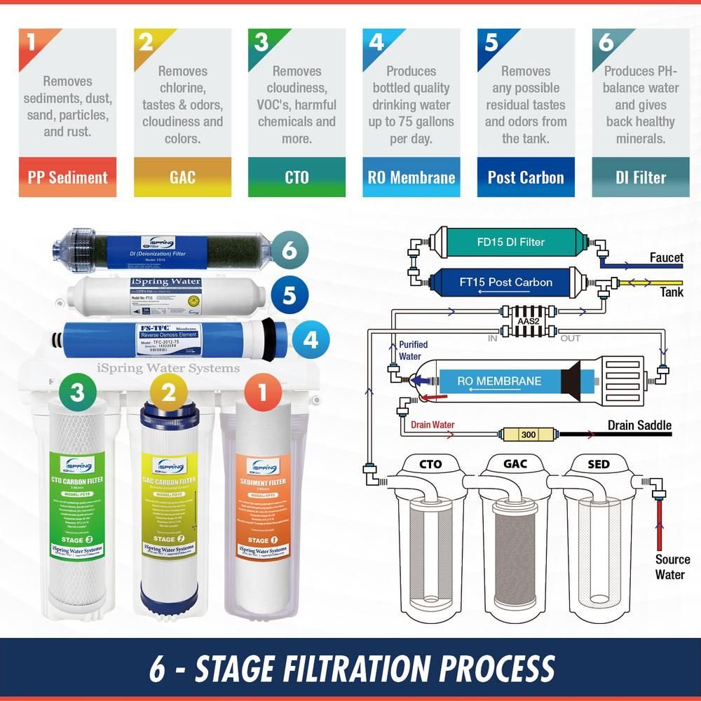 Eliminates chlorine and organic compounds that would damage the RO membrane. - RO Membrane (0.0001 micron)
